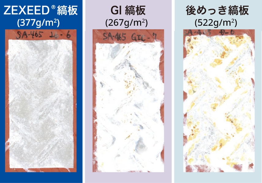 溶融亜鉛めっき(GI)縞板と比較して約10倍の耐食性を有します。
