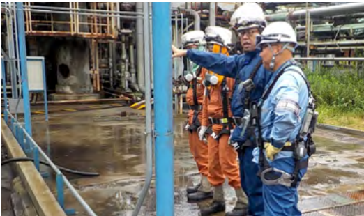 再発防止活動(初動訓練)では、より実践的な訓練として、高リスク設備、作業に関わる訓練や夜間・休日を想定した訓練を実施しております。訓練に関わる好事例の取組みを共有化するとともに地元消防署の協力も得ながら、各職場の訓練のレベルアップを推進しています。