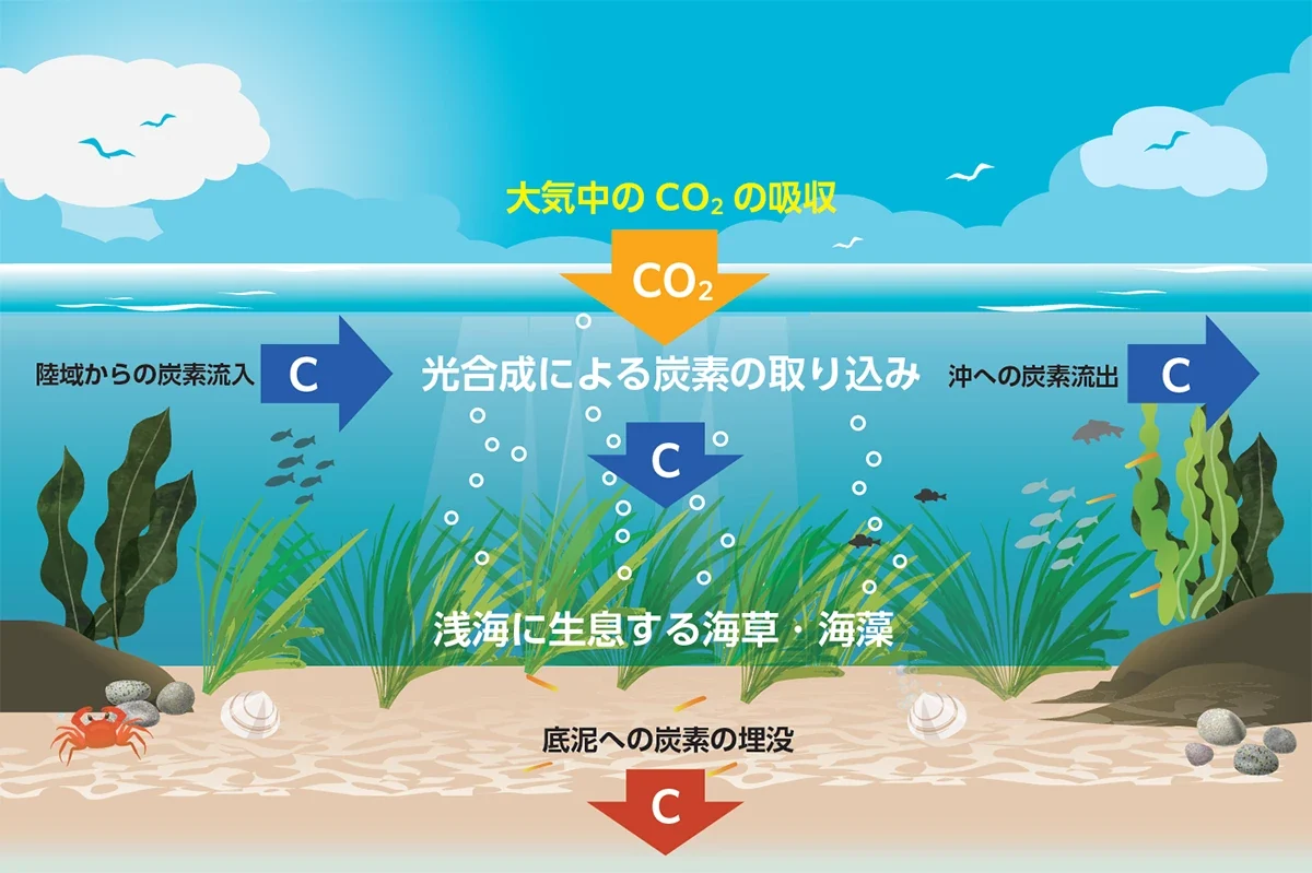 植物は光合成によって大気中のCO2を吸収し、炭素を蓄えます。アマモなどの海草、コンブなどの海藻もCO2を吸収する植物であり、海中でCO2を吸収し、枯死後に海底に堆積して炭素を貯留します。