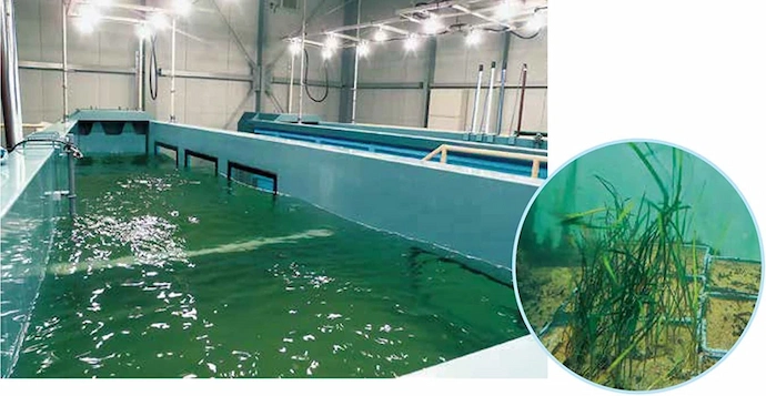 技術開発本部REセンター(千葉県富津市)の海域環境シミュレーター(シーラボ)では、鉄鋼スラグを活用したブルーカーボン生態系のCO2吸収量算定やカルシア改質土におけるアマモ成長評価実験など、藻場造成の有用性を科学的に実証しています。