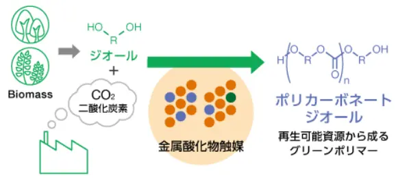 当社と、大阪公立大学、京都大学、東北大学、東京大学、UBE(株)は「CO2からのポリカーボネートジオール一段合成プロセスの開発」につき、2023年4月より研究開発に着手しました。ポリカーボネートジオールは、水素を必要としない高付加価値の炭素化合物を製造する代表的な素材であり、世界中で広く使われ、今後も需要増が見込まれる高機能ポリウレタンの原料ですが、合成時の環境負荷が高く大きな課題でした。これに対して、本研究開発では、CO等の毒性の高いガスの代わりにCO2を有効活用し、一段合成で高収率となる画期的なグリーンプロセスの開発を目指します。