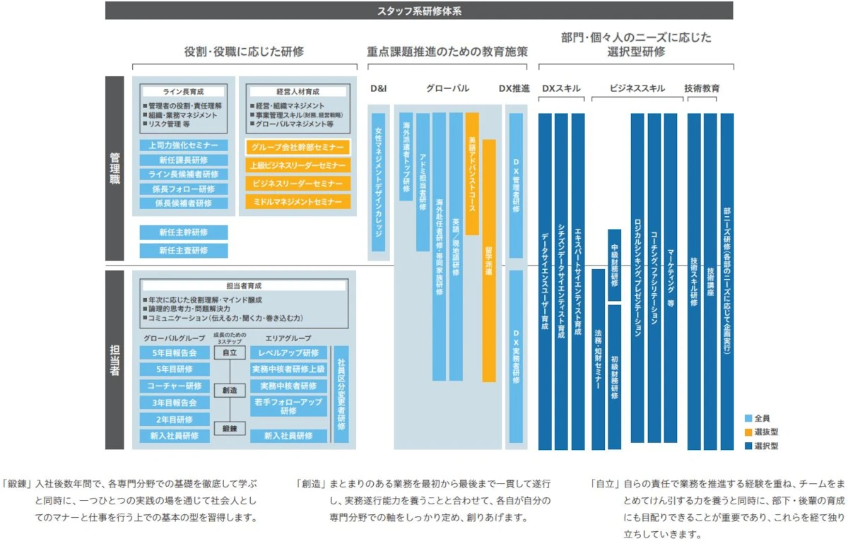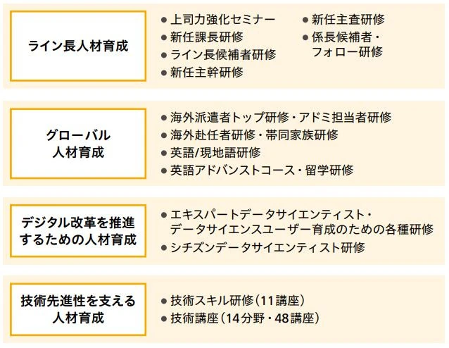 また、将来における国内外事業の担い手を育成するため、階層別研修に事業管理に必要な知識・スキルを習得するためのプログラムを織り込んでいます。