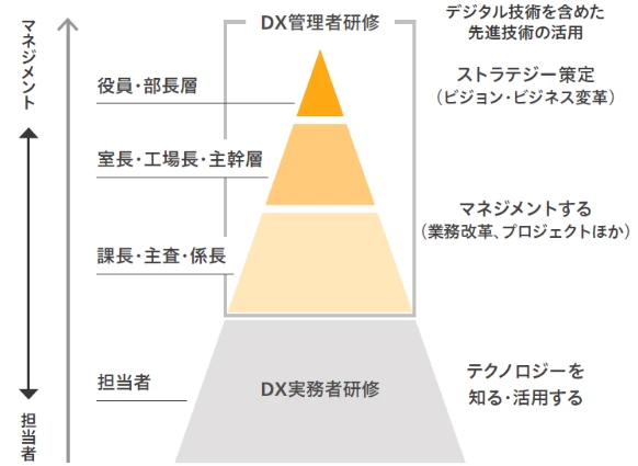 デジタルマネジメント教育では、業務部門においてデジタル技術を用いた業務プロセス改革を推進できるよう、全管理者を対象に、DX推進における管理者の役割理解および意識改革を促す教育を行っています。これら2軸での教育を行い、データとデジタル技術を駆使した生産・業務プロセス改革の推進を図ります。