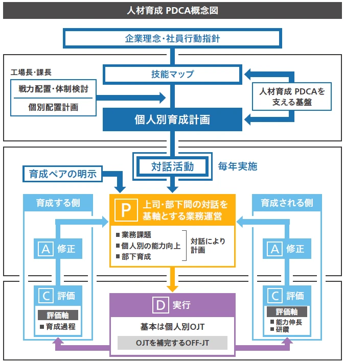 具体的には、習得すべき技能の一覧を技能マップとして明確にした上で上司と部下が対話し、具体的な育成計画を作成・実行しています。個人別OJT(On the Job Training)を中心に育成を実施しており、その進捗に基づき育成計画の修正・実行を繰り返すという人材育成のPDCAを回しています。