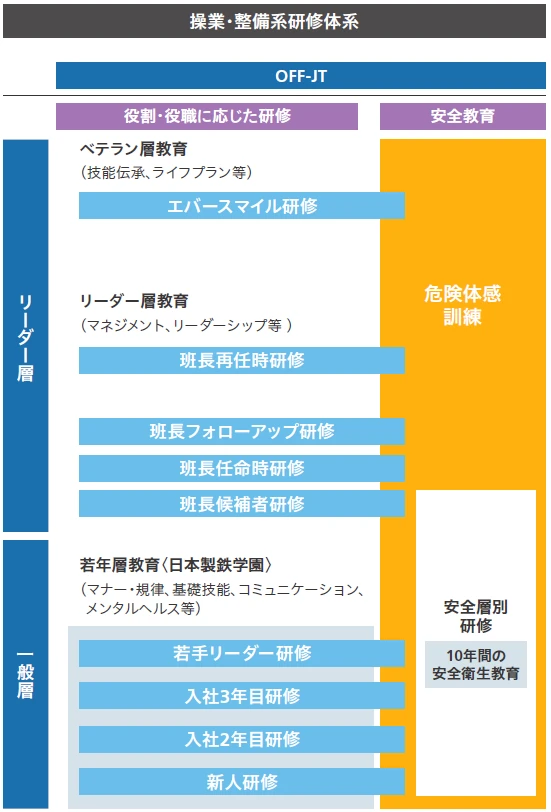 個人別OJTを補完するOFF-JTについても、日本製鉄の従業員として必要最低限習得すべき技能・知識を全社標準体系として階層ごとに整理し、全社統一的に実行しています。そのなかで、現場発の知恵(=現場技術)の創出力を一層引き上げていく職場リーダー教育や、高齢層が健康かつ意欲高く働き続けるためのモチベーション維持・向上施策等も推進しています。