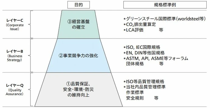 当社では、研究開発や事業活動を通じて創出した知的財産を、下図([研究開発・事業活動を通じて創出された知的財産])のとおり知的財産戦略に基づき秘匿、特許化、規格標準化、公開を組み合わせて事業に活用しています。規格標準化については、下図([規格標準化に係る当社の活動])のとおり品質保証、安全、環境、防災に係る社内活動をはじめ、JIS・ISO・API等に関する外部での活動にも積極的に参加して、鋼材および材料試験法等の規格化に取り組んでいます。鉄鋼製造のサステナビリティ基準や自社および他社の商品を投入する市場のルールを整えて、新商品の拡販等につなげて経営に貢献するとともに、鉄鋼業界が対象とする市場の形成とその拡大を図っています。自動車用鋼板・材料分野では、延性試験委員会ISO/TC 164/SC 2の議長に当社社員が就任して、規格活動をけん引しています。また、石油・ガス開発・生産環境向け鋼材製品に関連する分野では、当社社員が油井管に関する規格化を推進し、その功績が認められ米国AMPP (Association for Materials Protection and Performance:米国の材料腐食防食協会)の「2024 AMPP Fellow Honor Award」を受賞しました。