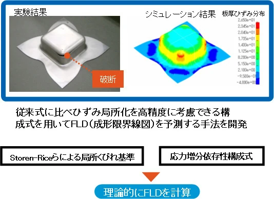従来解析では板厚ひずみ分布を評価できるが、破断発生の高精度な予測は困難です。