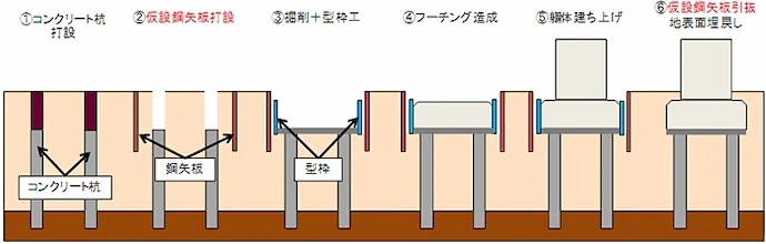通常コンクリート杭基礎:支持杭、仮設土留め、フーチング、引き抜きを順次実施