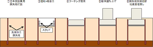 先端加工鋼矢板基礎:仮設土留めが支持杭を兼用。工程省略・建設費縮減が可能