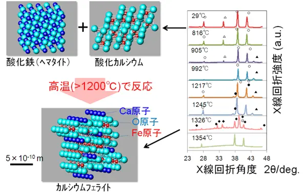 図3は、鉄鉱石(酸化鉄)と酸化カルシウムを混ぜて、高温で加熱した際に出来上がる焼結鉱中のカルシウムフェライトと呼ばれる化合物が、どのような温度で生成するかを高時間分解能XRDで詳細に調査した結果です。1326℃を超える高温で、初めて焼結鉱の特性を支配すると言われるカルシウムフェライトが生成し始める様子が観察されています。