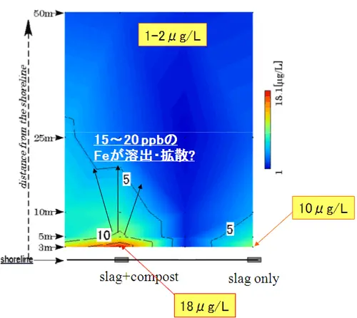 また、製鉄プロセスの副生成物であるスラグが磯焼けした海に海藻を繁茂させる効果があることが多くの調査で分かってきました。この機構を明らかにするために、施肥したスラグからの溶出した極微量(数10ppbレベル)の鉄イオンの海中への拡散の様子を観察することに成功しました(図4)。