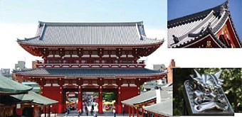 たとえば建築分野では、アルミナブラスト処理など独自の表面仕上げや陽極酸化法で発色させた独特の風合いや色彩のチタンが、文化財やランドマーク的な建築物の屋根や壁に使用されています。浅草寺の宝蔵門(下左写真)や本堂の屋根には、旧来の日本瓦の風合いを有するチタン製瓦が使用され、優れた耐食性と1/5の軽量化により、耐久性や耐震性が高められています。