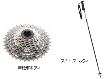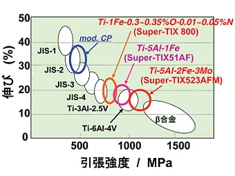 そのほか民生用途の材料として、Ti-15V-3Cr-3Al-3Sn等、従来のβ型合金に比べ、高温での変形抵抗が小さく、冷間加工性のより良好なβ型合金SSAT-2041CF(Ti-20V-4Al-1Sn)が開発されています。本合金は、溶体化処理ままでは柔らかく、高級自転車の後輪ギア用素材として使用され、好評価を得ています。また、本合金は、日本ステンレス工材でパイプに加工された後スウェージング加工、時効処理を施して、スキーストックが製造販売されています。耐衝撃強度に優れており、振動減衰性が評価され、08年には冬季オリンピックでも使用されました。
