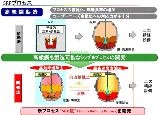 SRPにより、精錬(refine)する炉の仕事を単純化(simple)したことで、リンを徹底的に除去した高級鋼を、省資源・省エネルギー・低コストで高能率に製造できるようになったのです。