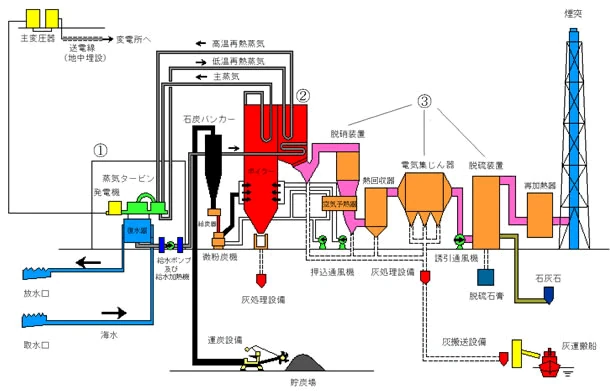 (1) | 蒸気を作る設備 | ボイラー(超臨界圧貫流形再熱式) | ボイラーで石炭を燃やし、その中にある多数のチューブの中を通る水が温められ、高温・高圧の蒸気を作ります。 |