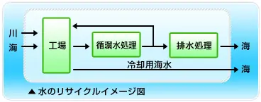 - 工場用水は、蒸発を除けばほぼ100%が回収・再生・再使用し、水資源を有効活用しています。