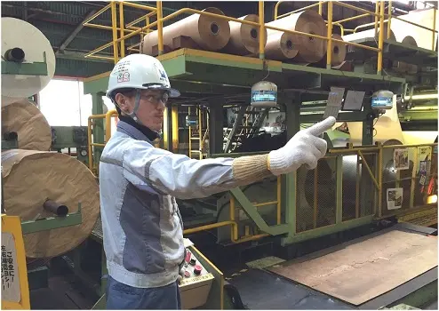 堅いチタン・特殊ステンレスの薄板を焼きなましし、表面に浮いた汚れを酸で洗うラインで働いています。生産ラインの入側、出側で密に連絡を取りながらチームで仕事を行っています。