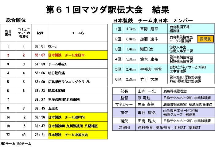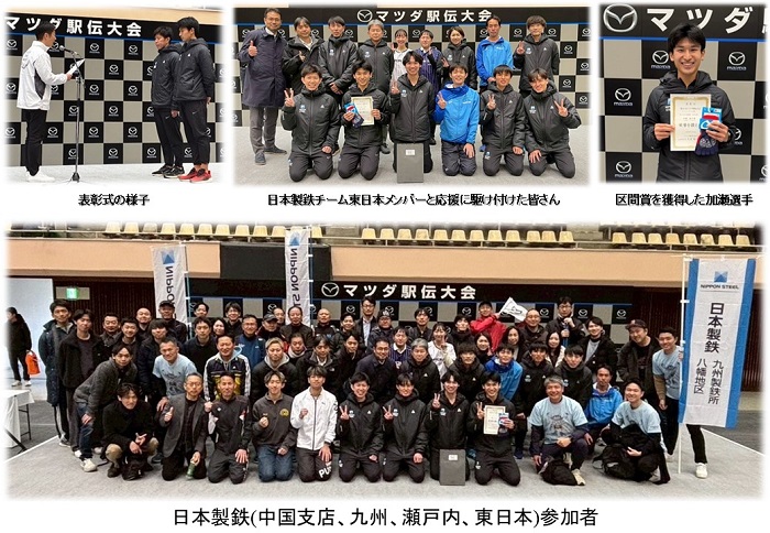 2026 年 3 月 8 日(日)マツダ株式会社/本社工場で開催された「第 61 回マツダ駅伝大会」に『日本製鉄チーム東日本』として参加しました。(一昨年優勝、昨年は 1 秒差の 2 位)この駅伝大会は 1966 年に社内行事として始まり、今回で 61 回目を迎える歴史のあるイベントで、本社工場構内の全工程約 17.1km を 6 区間に分けたコースで行われ、全 352 チームが参加しました。(当社からは 4 チームが参加)「日本製鉄チーム東日本」は、1 区から 6 区まで選手全員が昨年の雪辱を果たすべく優勝を目指して力走しましたが、昨年に続き 2 位という結果となりました。