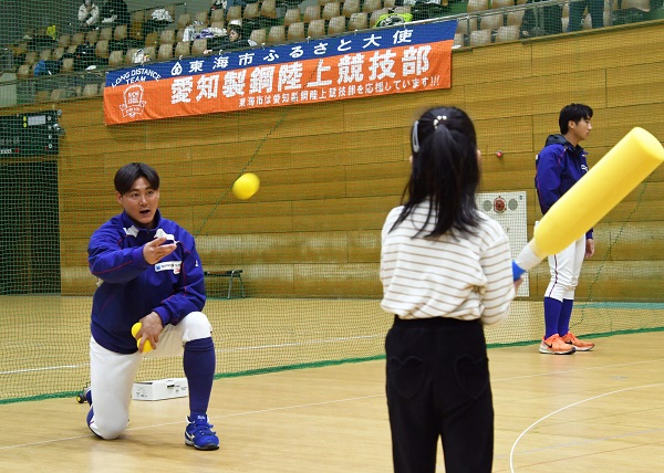 2月11日建国記念の日に、東海市民体育館で教育委員会主催「東海市ふるさと大使スポーツ等連携交流事業Fan!Fun!Fan!」が開催され、ふるさと大使を務める、日本製鉄東海REX、愛知製鋼陸上競技部、大同特殊鋼PhenixTOKAI(OB選手)の3団体が参加しました。この行事は、ふるさと大使であるスポーツ団体と連携し、選手と市民がイベントを通じて交流することで、同大使の認知度を高めるとともに、東海市のスポーツ推進計画である「スポーツに関わる人を増やし、健康で活力あるまちづくりに貢献」の醸成を図る一助とするもので、年少~小学生約150人が参加しました。