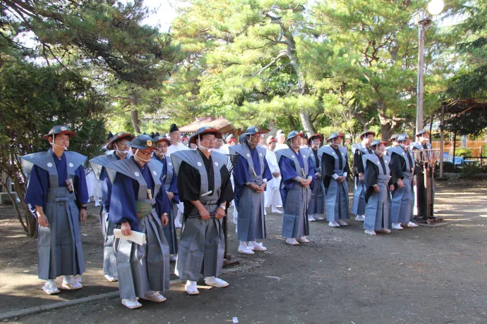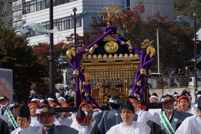 - 神輿を中心に2kmに及ぶ市内渡御を経て、御神体を乗せた船が尾崎神社奥の院に戻っていきます。