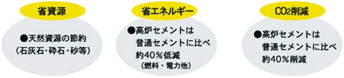 - スラグは、省資源、省エネルギー、二酸化炭素削減の地球に優しい資材です。