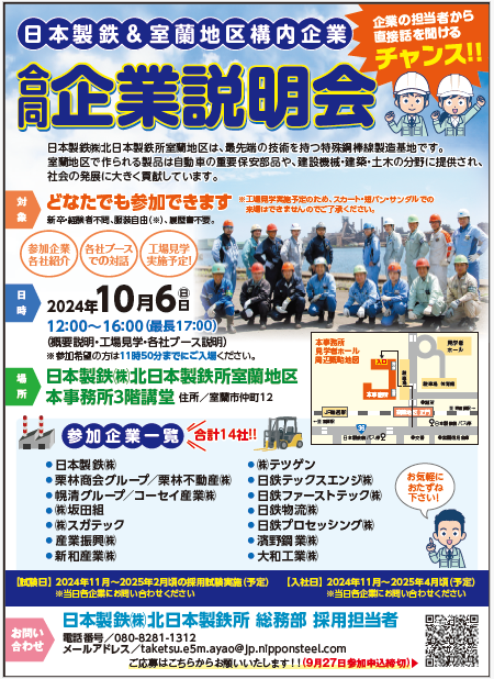 日本製鉄株式会社および室蘭地区構内各社による合同企業説明会を開催いたします。 どなたでもご参加いただけますので、是非ご参加ください!